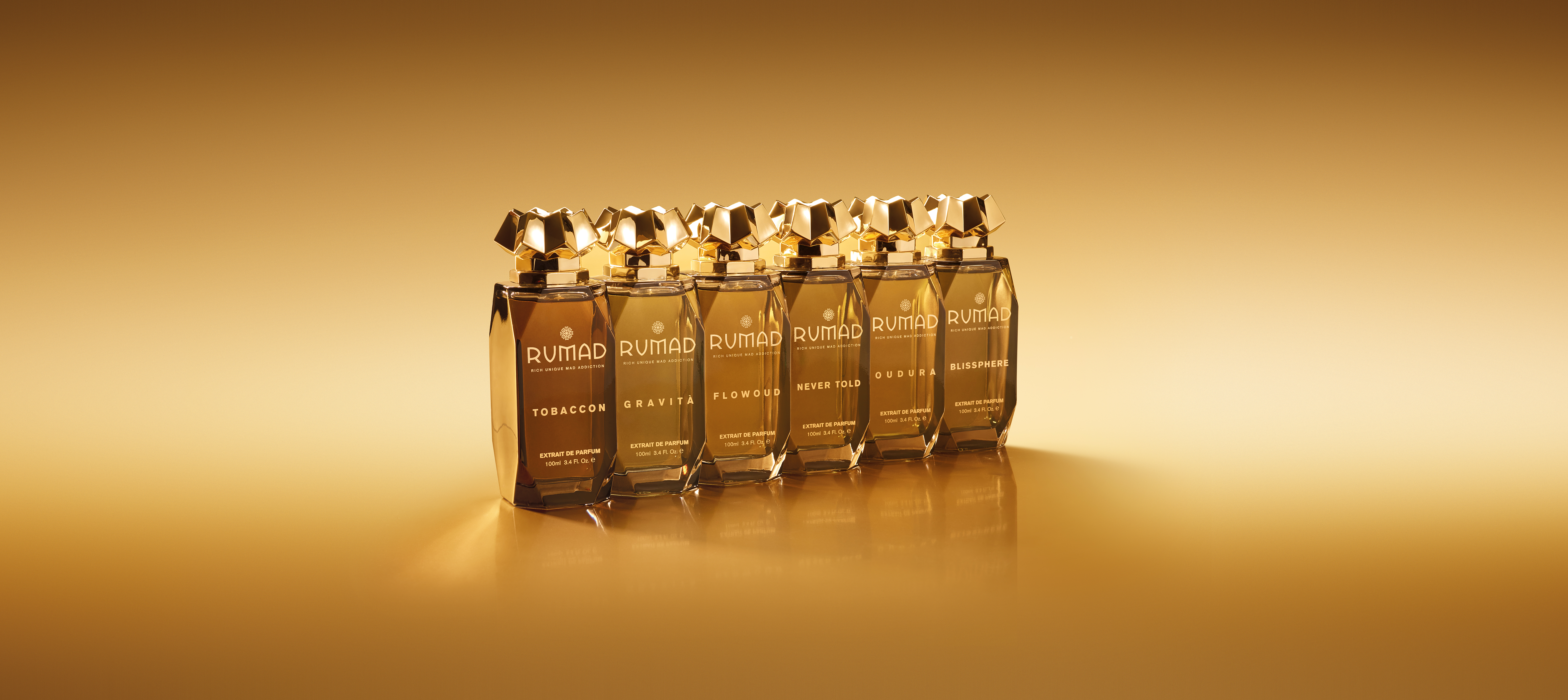 In Rumad, quattro concetti si trovano ai vertici del quadrato e racchiudono l’essenza del brand: rich, unique, mad, addiction. Ogni fragranza è l’espressione di queste qualità, dando vita a delle essenze che parlano di completezza.